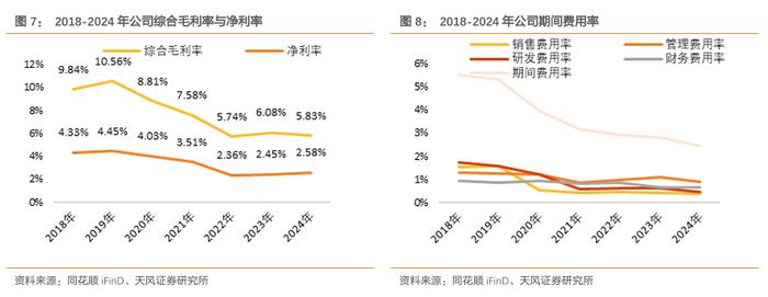 公司规模效应逐渐体现,期间费用率持续改善。2024年公司期间费用合计5.46亿元,销售、管理、研发、财务费用率分别为0.4%/0.9%/0.5%/0.7%。期间费用率为2.4%,相较于2019年的5.3%显著下降。随着公司营收规模逐渐扩大,规模效应持续体现,公司期间费用率有望进一步下降。
