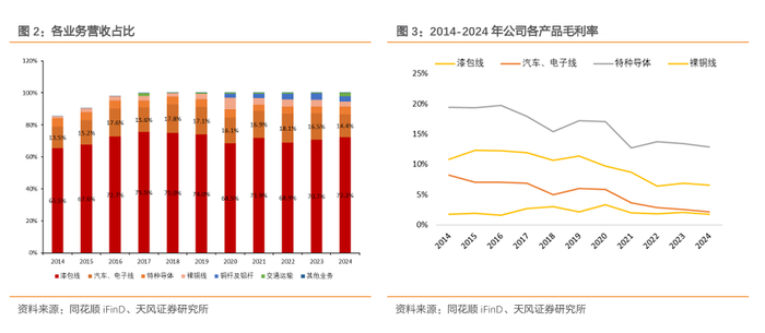 漆包线、汽车及电子线为公司两大营收主线,特种导体有望打造公司第二成长曲线。漆包线在公司营收中的占比常年维持在70%左右,2024年公司漆包线实现营收161.25亿元,占比72.2%。汽车及电子线是公司第二大营收来源,常年占比16%左右,2024年汽车及电子线实现营收32.06亿元,占比14.4%。从业务毛利率来看,漆包线、汽车及电子线毛利率近年呈下降趋势,2024年分别为6.58%/2.13%。公司全资子公司恒丰特导主要从事特种导体的研发、生产及销售,其产品毛利率大多高于公司传统主业,凭借自身优势和行业壁垒,为公司带来业绩增量。