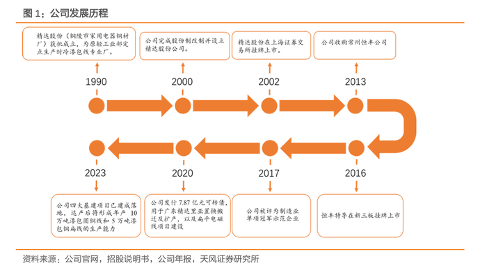 公司深耕电磁线领域30余年,为特种电磁线行业龙头。公司前身为1990年创立的铜陵市家用电器铜材厂,于2000年正式注册成立股份有限公司,同年被国家科技部认定为重点高新技术企业,专注于铜基电磁线、铝基电磁线、特种导体研发、制造、销售和服务,产品包括HFC134a压缩机用电磁线、HFC空调压缩机用多层复合电磁线、180级聚酯亚胺电磁线、200级聚酯亚胺复合聚酰胺酰亚胺电磁线、直焊性聚氨酯微细电磁线等的生产与销售。2002年,公司在A股主板成功上市,作为国内特种电磁线制造领域的龙头企业,公司拥有覆盖全国核心经济带的产销网络。