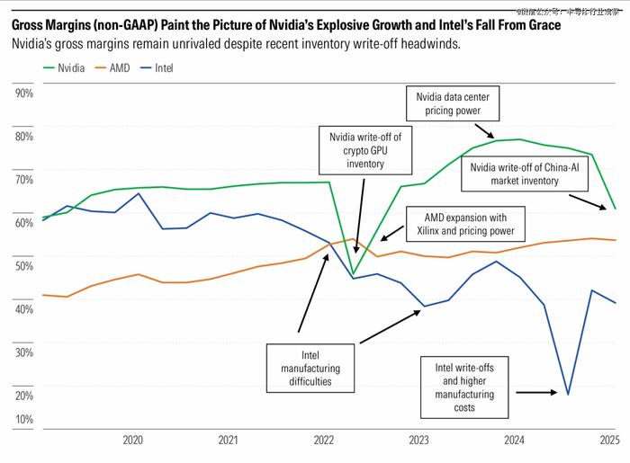 英伟达出色的毛利率支撑了我们对其宽阔护城河的评级;AMD 的毛利率稳步提升