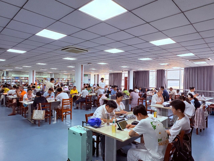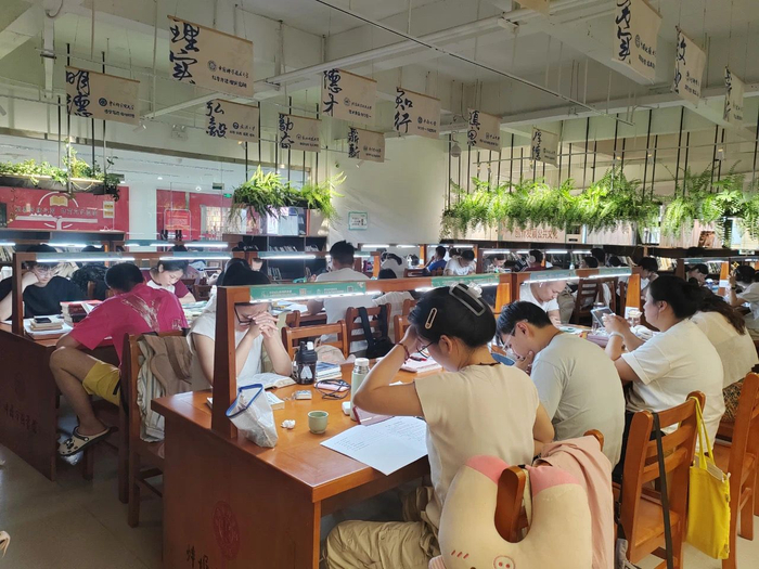 自修室内,不时传来沙沙的书写声。“现在放假了,我每天都会来图书馆备战考研。”读者吴先生表示,他每天八点半之前就到馆了,迟点来就找不到位置了。