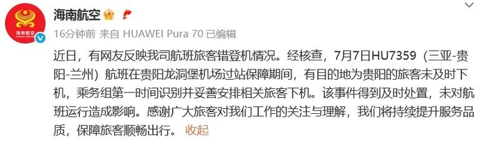 近日,有网友反映我司航班旅客错登机情况。经核查,7月7日HU7359(三亚-贵阳-兰州)航班在贵阳龙洞堡机场过站保障期间,有目的地为贵阳的旅客未及时下机,乘务组第一时间识别并妥善安排相关旅客下机。该事件得到及时处置,未对航班运行造成影响。感谢广大旅客对我们工作的关注与理解,我们将持续提升服务品质,保障旅客顺畅出行。