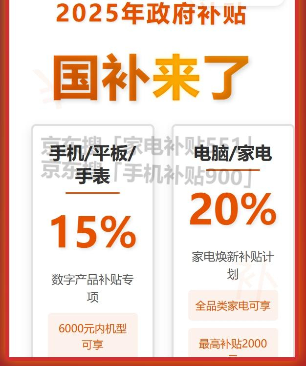 手机、平板、手表等3C产品,单价在6000元以内的可享15%补贴,最高减500元;