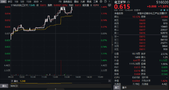 化工板块午后猛拉!反映化工板块整体走势的化工ETF(516020)震荡上行,截至发稿,盘中场内价格最高涨幅达到1.48%,截至发稿,涨1.32%。