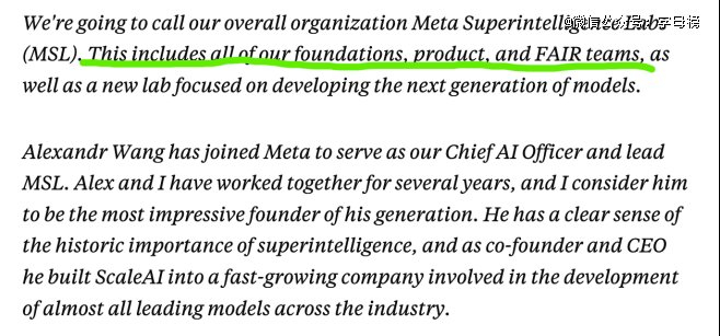 在官宣超级智能实验室成立的备忘录里,小扎写道:我们将把整个组织命名为 Meta 超级智能实验室(Meta Superintelligence Labs,简称 MSL),涵盖我们所有的基础研究团队、产品团队、FAIR团队,以及一个专注开发下一代模型的新实验室。