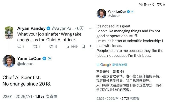 杨立昆有两则回应,一则是强调自己是从2018年起就是首席人工智能科学家,没有变过。一则是表示自己确实不擅长管理,更擅长科学方面的领导。