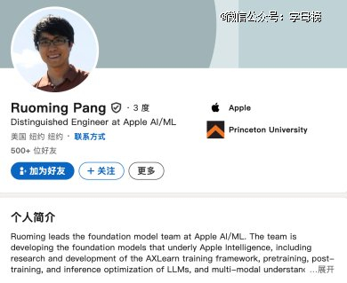 这也是一名华裔,名叫Ruoming Pang,是苹果基础模型团队(Artificial Intelligence Models,AFM)的负责人。
