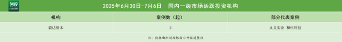 从投资方活跃度来看,本周毅达资本较为活跃,完成2笔投资,其中包括上海乂义实业有限公司以及杭州和伍系统科技有限公司。