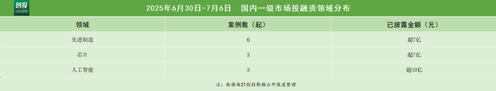 进入下半年第一周,先进制造、芯片、人工智能等赛道密集披露融资交易,一级市场再现热度回暖信号。在已披露交易中:医疗健康领域新披露融资中,山西锦波生物完成34.03亿元战略融资,由养生堂投资;天演药业(苏州)完成2500万美元战略融资,由赛诺菲投资。