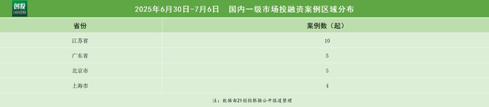 从披露获投企业的地域分布来看,本周的融资地区主要集中在江苏省、广东省、北京市、上海市,分别完成10笔,5笔、5笔、4笔融资。