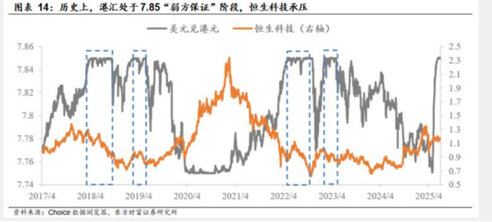 记者注意到,2017年以来,港汇曾四次持续触及7.85“弱方兑换保证”,区间内恒生科技表现均承压。