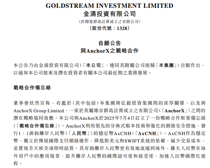 据悉,AxCNH是AnchorX发行的1:1挂钩离岸人民币的稳定币,其独立于SWIFT支付网络运行,支持全球即时清算。