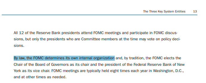 “根据法律,FOMC自行决定其内部组织结构。而按照传统,FOMC选举联邦储备委员会主席担任其主席,纽约联储主席担任其副主席,”该说明中写道。