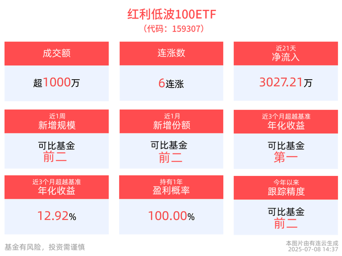 截至7月7日,红利低波100ETF近1年净值上涨16.43%,居可比基金第一。从收益能力看,截至2025年7月7日,红利低波100ETF自成立以来,最高单月回报为15.11%,最长连涨月数为2个月,最长连涨涨幅为5.84%,涨跌月数比为8/6,上涨月份平均收益率为3.47%,历史持有1年盈利概率为100.00%。截至2025年7月7日,红利低波100ETF近3个月超越基准年化收益为12.92%,排名可比基金1/4。
