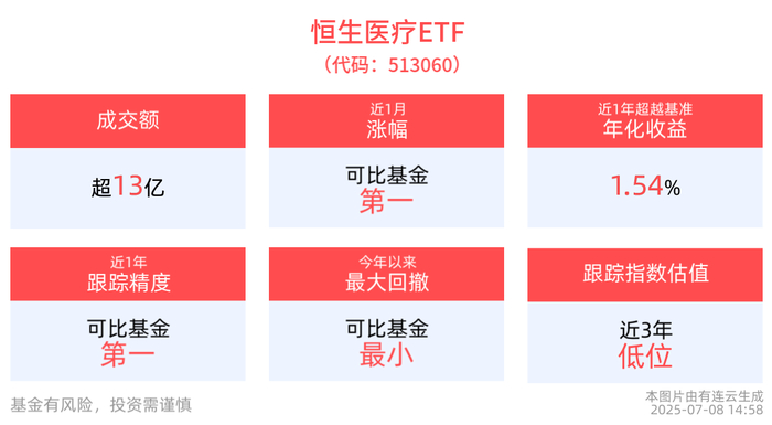跟踪精度方面,截至2025年7月7日,恒生医疗ETF近1年跟踪误差为0.070%,在可比基金中跟踪精度最高。