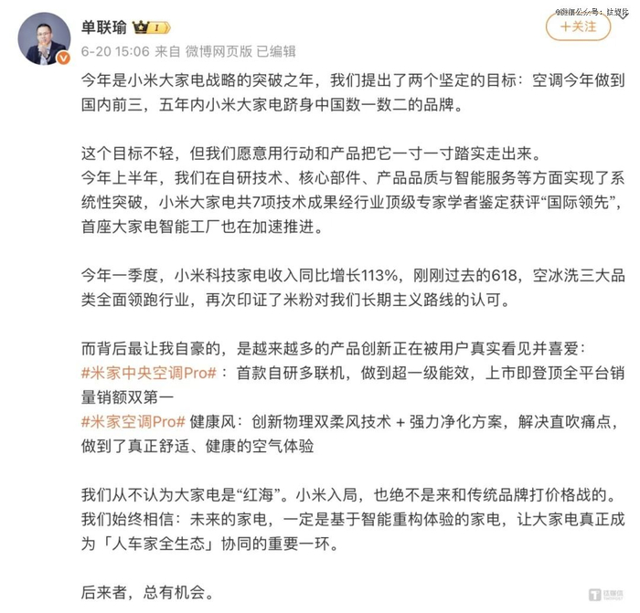 对于当前空调市场的价格战,除了格力高管的批判外,之前多家企业也表达过自身的观点和应对。比如小米单联瑜不认为大家电是“红海”,小米入局,也绝不是来和传统品牌打价格战的。在今年一季度的业绩会上,小米集团合伙人、集团总裁卢伟冰表示,从来不担心价格战,价格战背后是成本和效率之争。