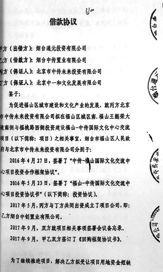 2016年5月24日,烟台市福山区政府与北京中传公司签订《福山-中传国际文化交流中心项目投资协议书》,约定合作方式为:福山区政府所属的烟台润福建设投资有限公司(后调整为烟台通元公司)与北京中传公司共同出资组建中心项目公司;出资比例及方式为,润福投资以项目中15亩文化广场、文化孵化中心的土地款作为出资,北京中传公司以剩余的约45亩土地款及项目建设投资作为出资。