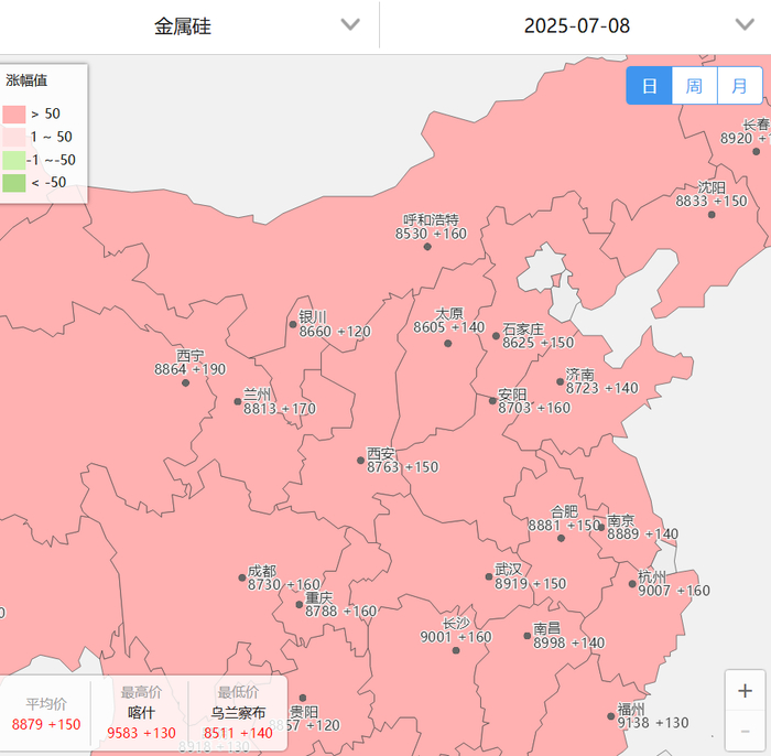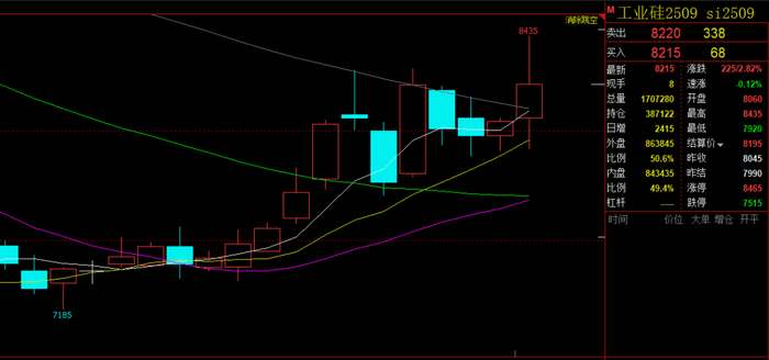 今日工业硅期货行情继续翻红运行,盘面价格明显走高!7月8日,截止15:00收盘,工业硅主力合约2509收盘翻红运行,开盘8060,收盘上调225至8215,涨幅2.82%,收盘价格相较上一交易日上调173。另,主力合约当日成交总量为1707280手,持仓量387122手,当前总持仓量628857手,具体如下图所示: