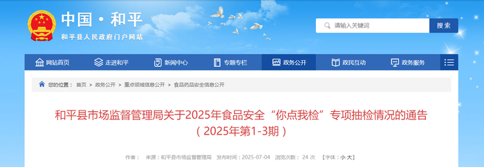 广东省河源市和平县市场监督管理局关于2025年食品安全“你点我检”专项抽检情况的通告(2025年第1-3期)