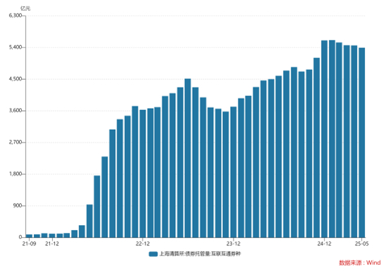 据债券通官网显示,2025年5月,债券通“北向通”成交9156亿元,较2018年同期增长12.79倍,作为对比的是,据Wind数据显示,截至5月末南向通存量债券托管规模为5395.19亿元,今年以来规模有所走弱,较年初下行超200亿元。