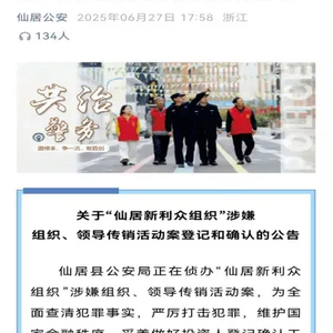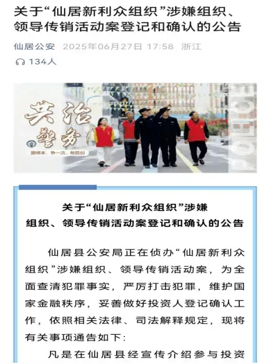 2025年6月27日,浙江省仙居县公安局发布了《关于“仙居新利众组织”涉嫌组织、领导传销活动案登记和确认的公告》,告知公众仙居警方正在对“新利众组织”涉嫌组织、领导传销活动立案侦办。
