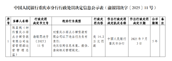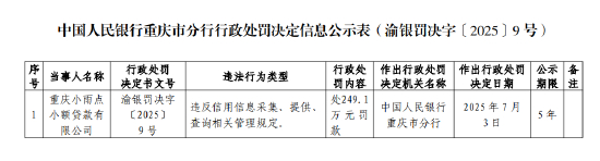 7月8日金融一线消息,据中国人民银行重庆市分行行政处罚决定信息公示表显示,重庆小雨点小额贷款有限公司因违反信用信息采集、提供、查询相关管理规定,被处249.1万元罚款。