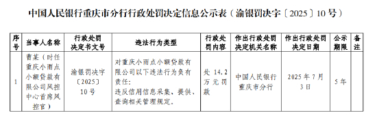 同时,曹某(时任重庆小雨点小额贷款有限公司风控中心首席风控官)对重庆小雨点小额贷款有限公司以下违法行为负有责任:违反信用信息采集、提供、查询相关管理规定,被处14.2万元罚款;陈某帆(时任重庆小雨点小额贷款有限公司运营管理部运营管理总监)对重庆小雨点小额贷款有限公司以下违法行为负有责任:违反信用信息采集、提供、查询相关管理规定,被处14.2万元罚款。
