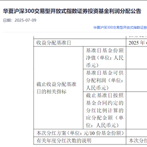 7月8日晚间,华夏沪深300ETF发布2025年度首次分红公告。截至分红基准日6月30日,基金可供分配利润为79.08亿元,本次分红方案为每10份基金份额分红0.6元。权益登记日7月11日,分红及除权日为7月14日。