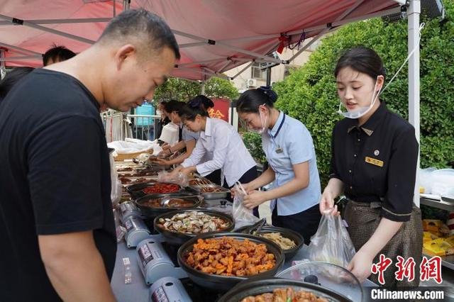 连日来,河南郑州多家星级酒店开启“摆摊模式”,以“星级手艺、街头价格”撬动消费新市场,引来不少市民排队尝鲜。图为酒店工作人员为顾客打包菜品。 赵梦阳 摄