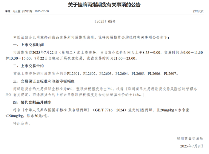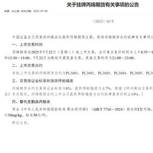 郑商所:丙烯期货自2025年7月22日(星期二)起上市交易