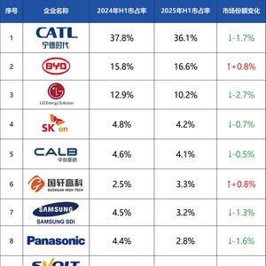 相比之下,宁德时代1-5月动力电池装机量同比下降3.83%。搭载其电池的车企中,鸿蒙智行因产品新老款切换及季节因素,2025年1-4月销量同比下滑8.6%;广汽埃安上半年销量同比下跌14%,是唯一销量下滑的新能源车企。与此同时,日韩企业市场份额普遍压缩,LGES市场占有率同比下跌2.7%,跌幅最大,SK on、三星SDI和松下分别下跌0.7%、1.3%和1.6%。尽管LGES和SK on装机量有所上升,但市场份额仍在下滑,这表明2025年全球动力电池市场竞争激烈,行业格局仍在持续重塑。