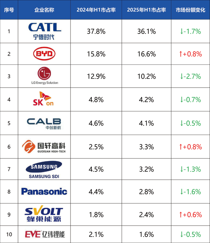 2024、2025年H1全球动力电池装机量占比及其市场份额变化