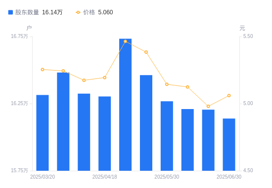 近一年(2024年6月30日至2025年6月30日),吉电股份A股股东户数从19.42万户,减低至16.14万户,降幅16.88%,区间股价下跌2.64%。