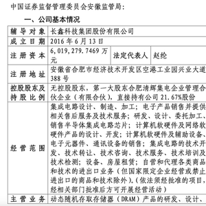 7月7日,中国证监会网站披露,位于安徽合肥的长鑫科技在安徽证监局办理辅导备案登记,正式启动A股上市进程,辅导机构为中国国际金融股份有限公司、中信建投证券股份有限公司。辅导文件显示,长鑫科技注册资本达601.9亿元,无控股股东。第一大股东为合肥清辉集电企业管理合伙企业(有限合伙),直接持有公司21.67%股份。
