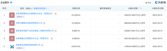 天眼查信息显示,长鑫科技自2018年启动天使轮融资以来,累计完成了7轮融资,当前公司股东总数达到49位,其中国资背景股东占比显著:除国家集成电路产业投资基金二期(持股约9.8%)外,第二大股东合肥市国资委旗下的合肥长鑫集成电路有限责任公司直接持股12.43%,安徽省国资委控股的国有企业安徽省投资集团控股有限公司亦持股8.87610%,位列第五大股东。
