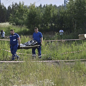 当地时间2025年7月7日,莫斯科州奥金佐沃市,俄罗斯执法人员搬运前交通部长罗曼·斯塔罗沃伊特的尸体。图/视觉中国