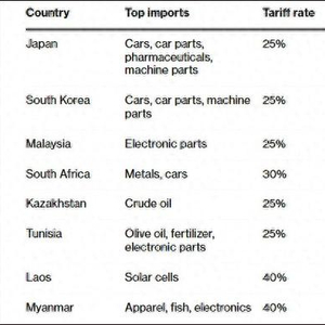 据特朗普公布,美国将对日本和韩国征收25%关税、对缅甸和老挝征收40%、对柬埔寨和泰国征收36%、对孟加拉国和塞尔维亚征收35%、对印尼征收32%、对南非和波斯尼亚和黑塞哥维那征收30%、对哈萨克斯坦、马来西亚和突尼斯征收25%。