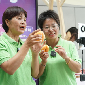 图为2023年7月18日,在2023北京·平谷鲜桃季“土特产”市集现场,工作人员通过直播的方式进行桃子销售。新华社记者 任超 摄
