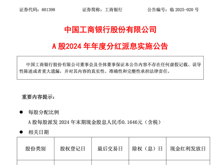 2025年6月27日,工商银行2024年度股东年会审议通过了2024年度利润分配方案。此次分红的发放年度为2024年,分派对象为截至2025年7月11日股权登记日下午上海证券交易所收市后,在中国证券登记结算有限责任公司上海分公司登记在册的全体A股股东。