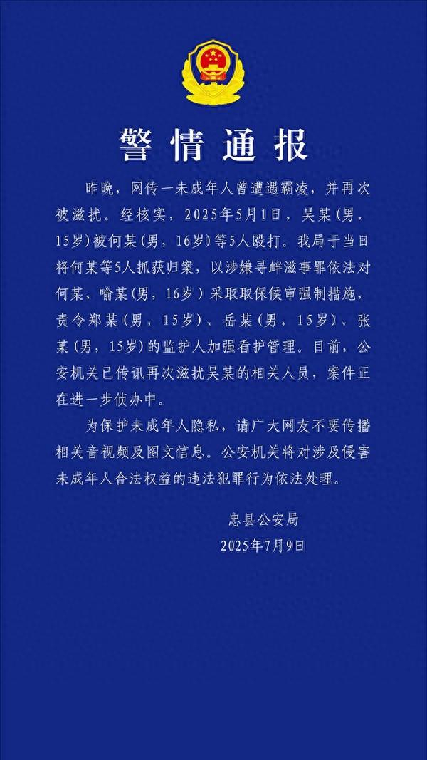 重庆忠县公安局微信公众号“平安忠县”7月9日消息,昨晚,网传一未成年人曾遭遇霸凌,并再次被滋扰。经核实,2025年5月1日,吴某(男,15岁)被何某(男,16岁)等5人殴打。我局于当日将何某等5人抓获归案,以涉嫌寻衅滋事罪依法对何某、喻某(男,16岁)采取取保候审强制措施,责令郑某(男,15岁)、岳某(男,15岁)、张某(男,15岁)的监护人加强看护管理。目前,公安机关已传讯再次滋扰吴某的相关人员,案件正在进一步侦办中。