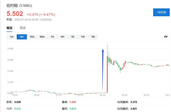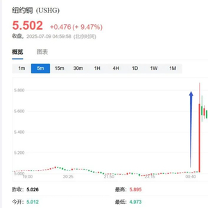 特朗普称将实行铜关税后,周二美股午盘时段,纽约期铜主力合约COMEX 9月期铜合约涨幅迅速扩大,一度逼近5.90美元,日内涨幅达到17.3%。媒体称,这至少创下了1988年以来纽铜最大的盘中涨幅。到收盘,COMEX 9月期铜收涨13.1%,报5.6855美元/磅,创收盘最高纪录。
