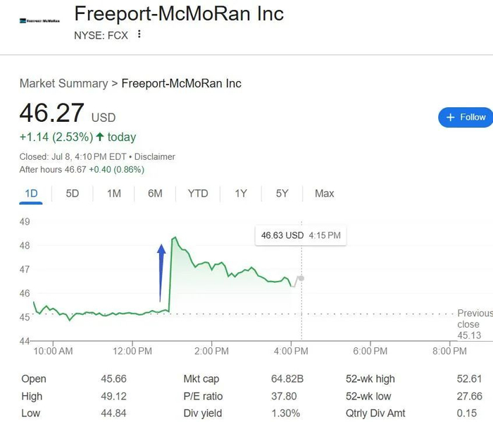 产铜为主营业务之一的美国矿业公司Freeport-McMoran(FCX)股价拉升,一度涨超8.8%,最终收涨2.5%。