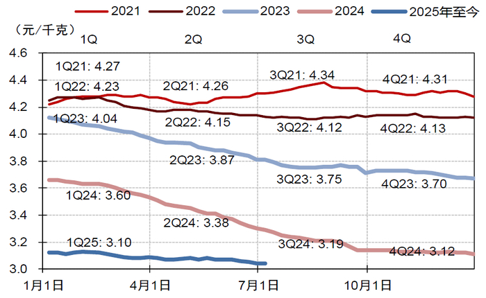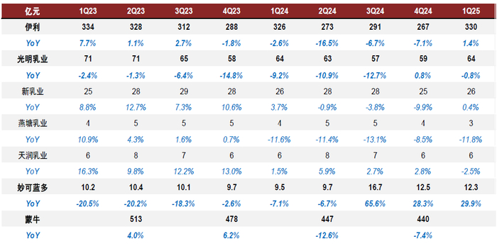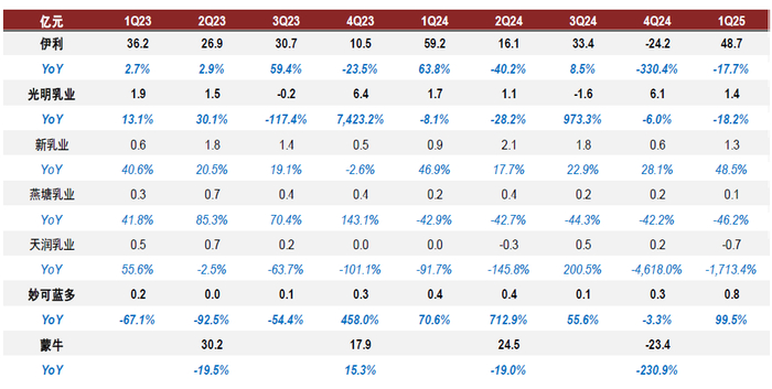 25年盈利有望继续修复。成本端,农业部数据显示1H25原奶价格同比下降约11.8%,环比跌幅有限,我们预计成本下降有望使乳企25年毛利率受益,而费用端,考虑年初至今渠道及终端库存水平保持良性,价盘较为稳健,企业费用投入较为保守合理。1Q25受益于原奶成本下降及费用投入相对谨慎,乳企核心利润率实现较好提升;受益于2Q24去库存造成的较低基数,我们预计2Q25乳企利润率较好恢复。此外,我们预计2H25年奶价或有望逐渐企稳,行业竞争格局或有望逐渐改善;展望25年利润端,我们预计乳企利润率有望继续修复。