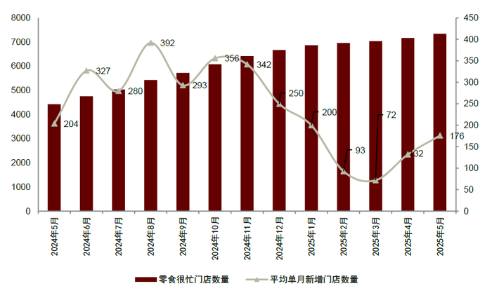 1)零食量贩渠道:零食量贩渠道仍保持门店扩张趋势,1Q25由于春节相对偏早以及头部品牌减少部分补贴整体新增门店数量有一定放缓,2Q25开始加速拓店,据零食很忙公众号,零食很忙1Q25门店数增加超360家、4-5月合计门店数超300家。另外,零食量贩品牌均开始积极拓展品类,尝试运营省钱/折扣超市的新店型,截至2025年6月零食有鸣折扣超市(含零食店升级调改为折扣超市门店)超2000家,另外赵一鸣、好想来等品牌亦尝试扩品类打磨折扣超市业态,比如增加了如烘焙、卡游潮玩、冷柜(如鲜奶、冷冻食品等)、调味品、家庭清洁、个人日化、纸品、女性卫生用品等品类。