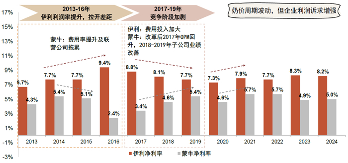 注:蒙牛2016年净利率剔除商誉减值及库存减值,2024年净利率剔除商誉减值;伊利2024年净利率剔除商誉减值及卖矿受益