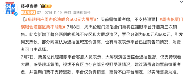7月7日,票务总代理猫眼平台客服人员表示,大屏观演区因控台遮挡视野,仅支持观看大屏、感受现场氛围,视线不良区也存在部分视野受限情况,建议消费者购票前慎重考虑,并强调门票不支持退款。平台仅负责销售,票价不由平台制定,以实际售卖为准。