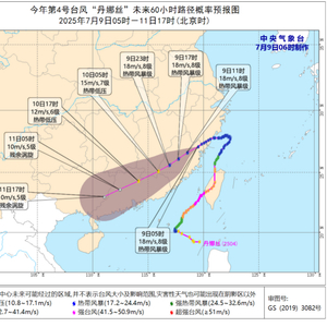 今年第4号台风“丹娜丝”(热带风暴级)于昨天(7月8日)晚上21时25分前后在浙江省温州市洞头区沿海登陆,登陆时中心附近最大风力9级(23米/秒),中心最低气压990百帕;之后于23时45分前后在浙江省温州瑞安市沿海再次登陆,登陆时中心附近最大风力8级(20米/秒),中心最低气压992百帕。今天早晨5点钟“丹娜丝”的中心位于福建宁德福安市境内,就是北纬27.1度、东经119.5度,中心附近最大风力有8级(18米/秒),中心最低气压为995百帕。