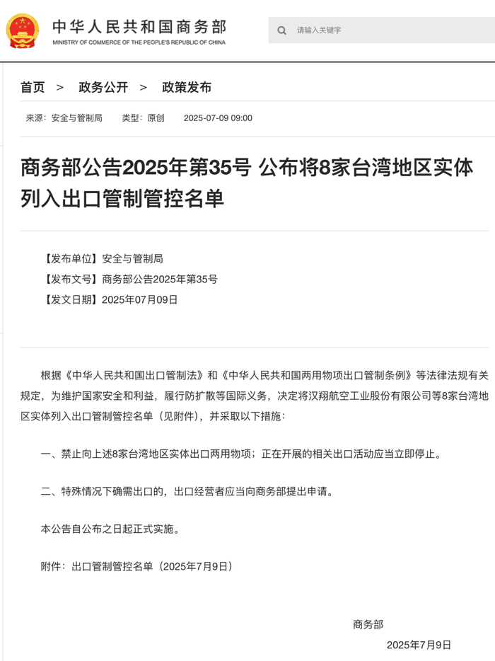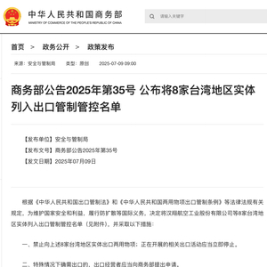 据商务部网站7月9日消息,将8家台湾地区实体列入出口管制管控名单。