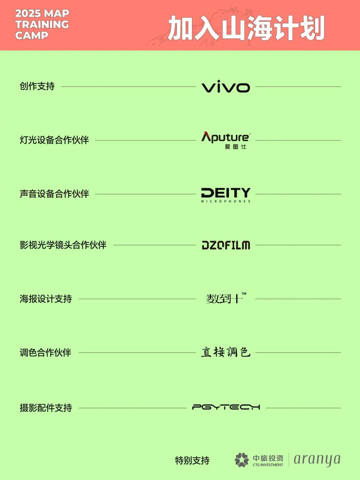 本届山海训练营的合作伙伴vivo将带来手机创作工作坊,帮助青年导演实现手机影像的创作与叙事表达。训练营期间,山海计划20强青年导演将使用vivo旗舰影像手机X200 Ultra,完成各自约3分钟的驻地短片拍摄。该组短片将作为训练营的结营成果举行专场放映交流。