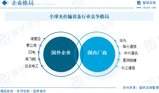 光传输设备市场竞争格局激烈且多元化,国内外众多知名厂商共同参与市场竞争。国内企业如华为、中兴通讯、烽火通信等凭借强大的技术实力和市场份额占据行业领先地位;国际企业如诺基亚、爱立信、日电、英飞朗、住友电工等也在全球范围内拥有广泛的客户基础和品牌影响力。供应商们不断加大研发投入,推出新型光纤技术和光模块,以提升传输效率和抗干扰能力。例如,800G、1.6T等高速光模块逐渐商用化,成为市场主流。新型光纤技术的优化也提升了传输效率和抗干扰能力,进一步推动了光传输设备行业的发展。未来,市场竞争将更加激烈,企业需要不断提升自身的技术实力和产品质量,以应对市场的变化和挑战。